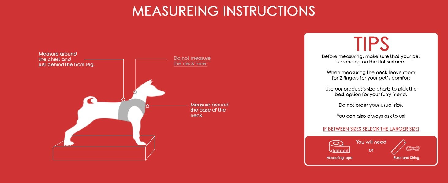 Please measure your pet’s chest and neck girth and refer to our size chart.